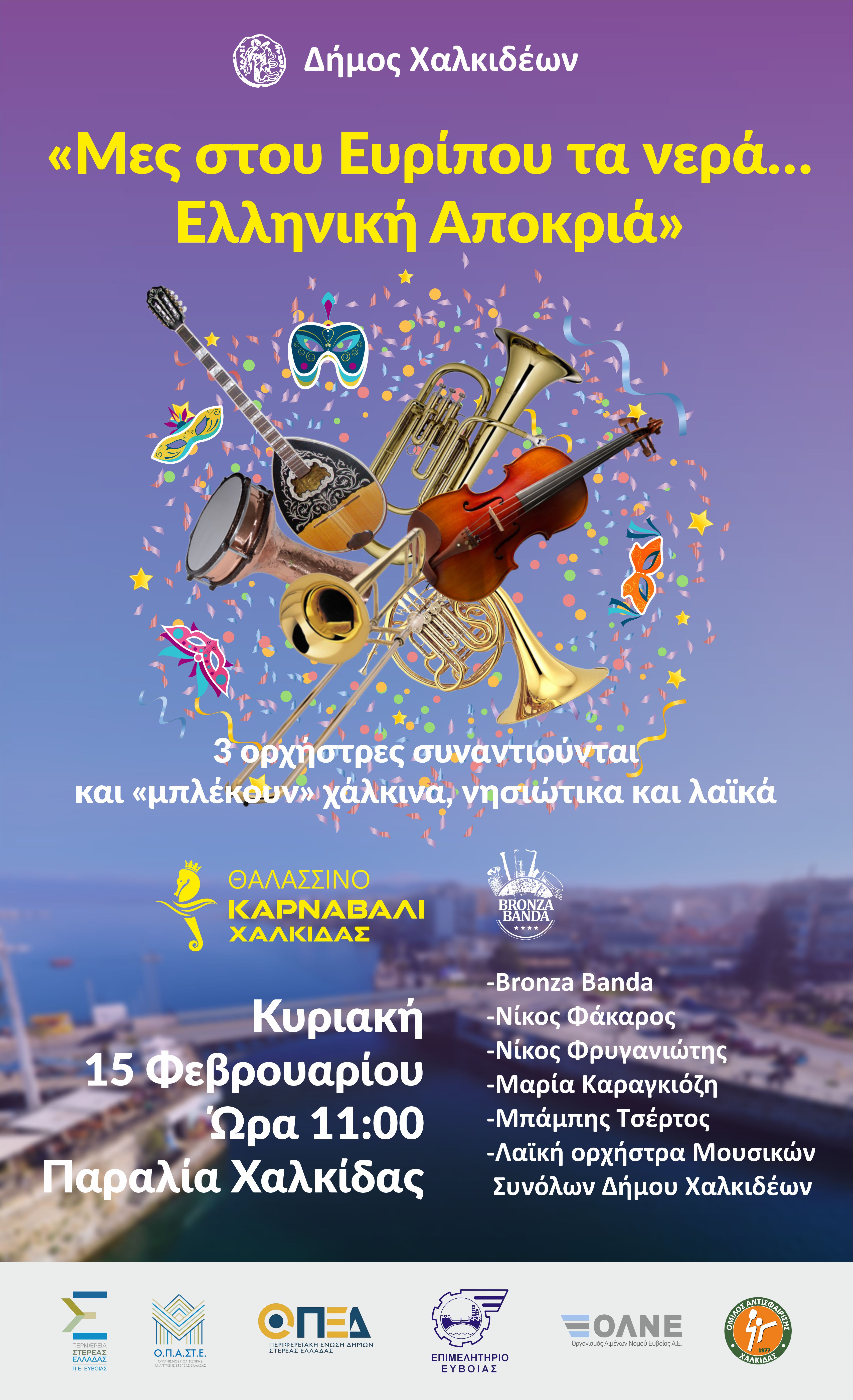 Η παραλία της Χαλκίδας γεμίζει ρυθμό, χρώμα και ελληνική παράδοση. 3 ορχήστρες συναντιούνται στο Στρογγυλό με Πολιτιστικούς Συλλόγους της πόλης και «στήνουν» ένα μεγάλο ελληνικό γλέντι, με μουσικές, έθιμα και αποκριάτικα δρώμενα από κάθε γωνιά της Ελλάδας.