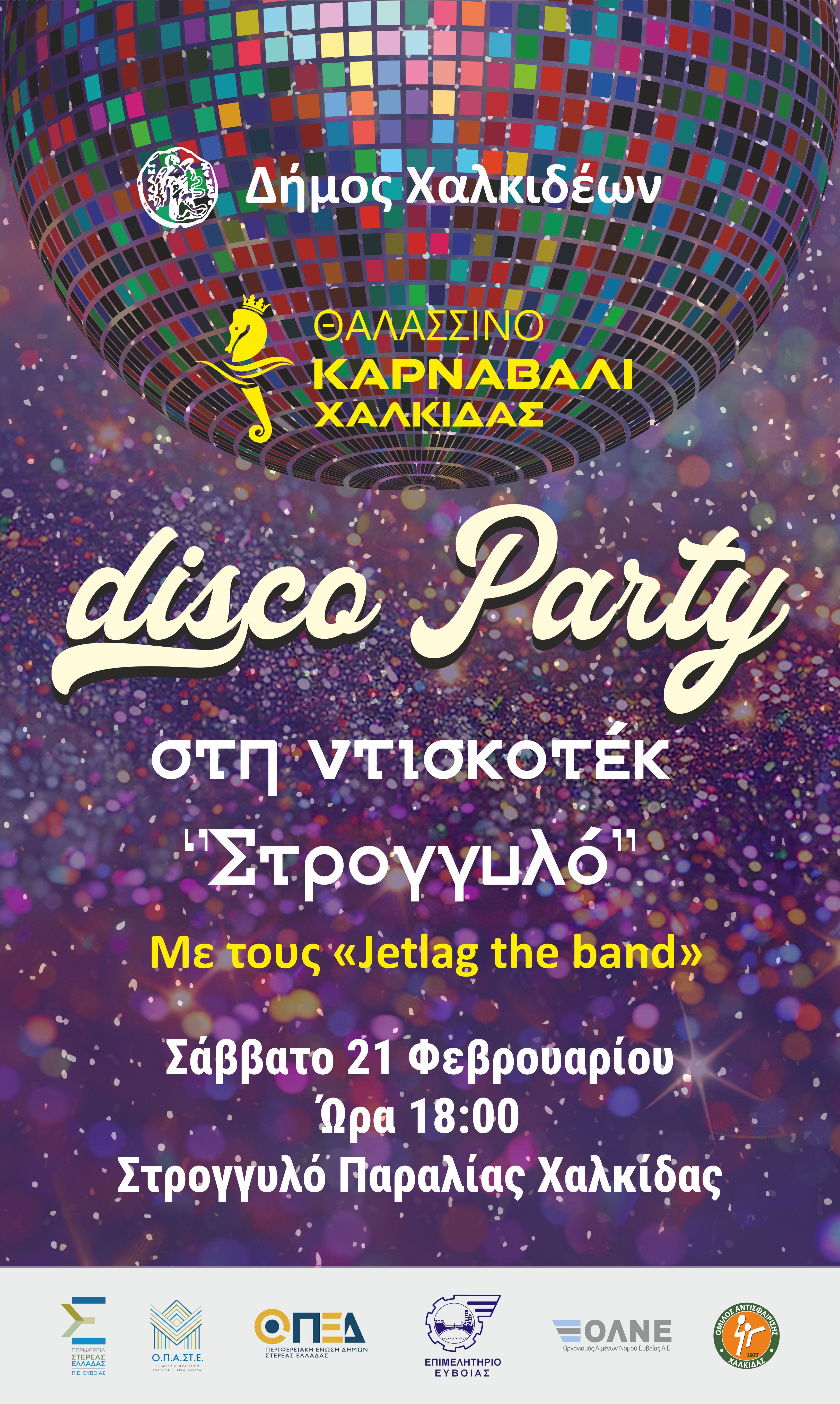 Η διασκέδαση δεν σταματά και μετά την παρέλαση το Στρογγυλό της παραλίας μετατρέπεται στην πιο «in» Ντισκοτέκ της Χαλκίδας. Φώτα, ντισκόμπαλες, αποκριάτικη ενέργεια και ατελείωτος χορός σε ρυθμούς disco, 80s και 90s γεμίζουν την παραλία μαζί με τους «Jetlag the band» LIVE, που υπόσχονται μια αξέχαστη βραδιά που ξεσηκώνει.