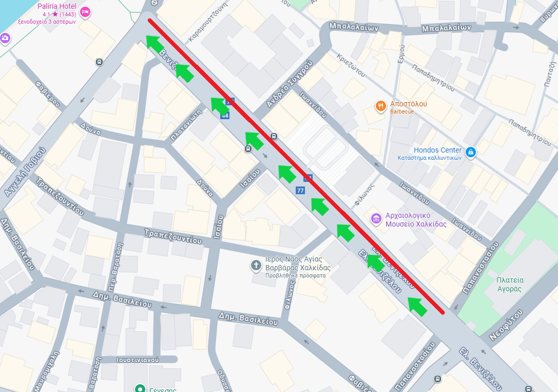 📍Τα οχήματα που εισέρχονται στη Λεωφόρο Ελ. Βενιζέλου, μέσω των οδών Παπαναστασίου, Ισαίου, Πλατανιώτη και Βαρατάση θα μπορούν να κινηθούν μόνο με κατεύθυνση προς την παραλία Χαλκίδας.