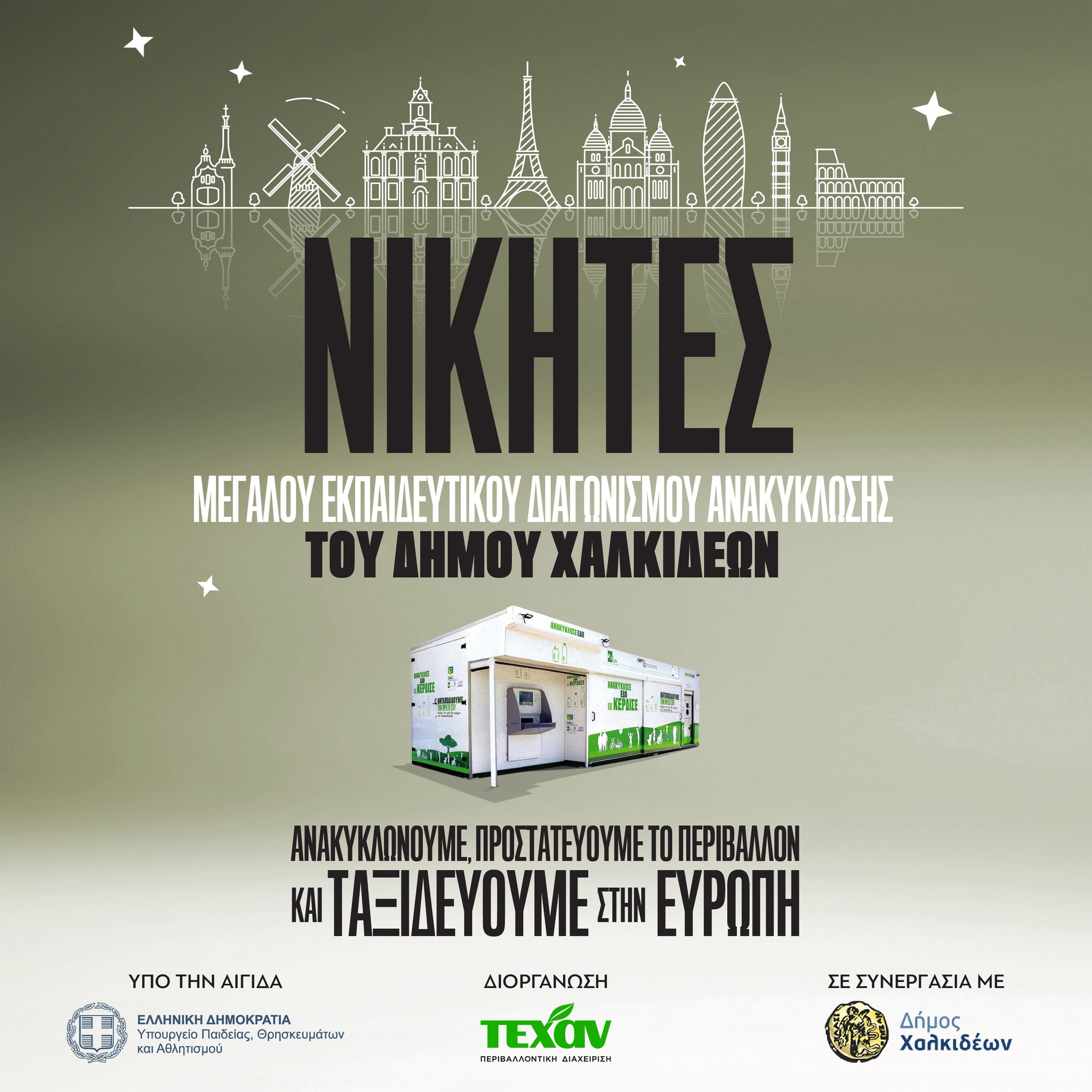 Ολοκληρώθηκε με επιτυχία ο μεγάλος Εκπαιδευτικός Διαγωνισμός Ανακύκλωσης σχολειών του Δήμου Χαλκιδέων, ο οποίος πραγματοποιήθηκε από την εταιρεία TEXAN με τη συνεργασία του Δήμου και υπό την αιγίδα του Υπουργείου Παιδείας, Θρησκευμάτων και Αθλητισμού.