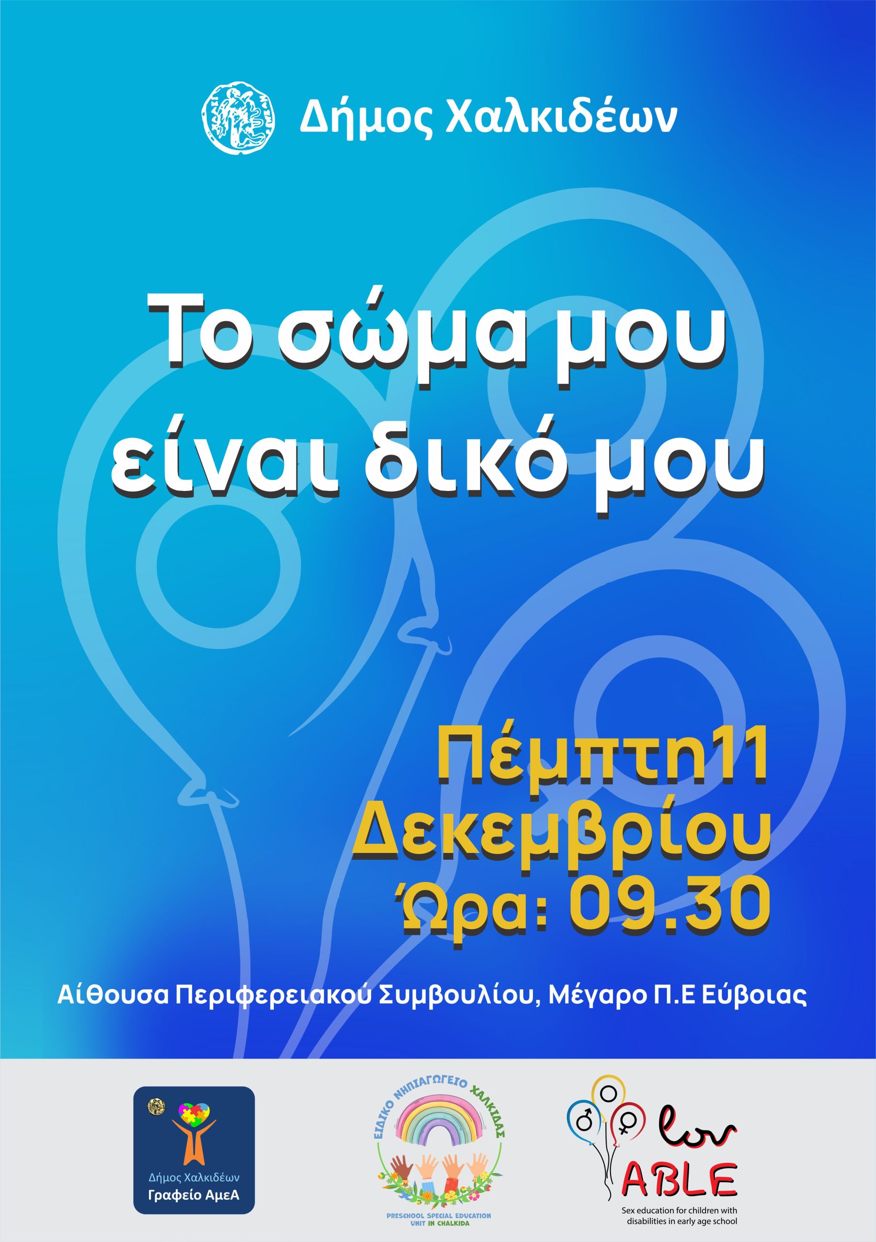 Ο Δήμος Χαλκιδέων, σε συνεργασία με το Ειδικό Νηπιαγωγείο Χαλκίδας, διοργανώνουν τη συμπεριληπτική και βιωματική δράση «Το σώμα μου είναι δικό μου», που απευθύνεται σε παιδιά ΑμεΑ και μη, με στόχο να αποκτήσουν γνώσεις και δεξιότητες, ώστε να προστατεύουν τον εαυτό τους, να θέτουν όρια και να αναγνωρίζουν την αξία και την μοναδικότητά τους.