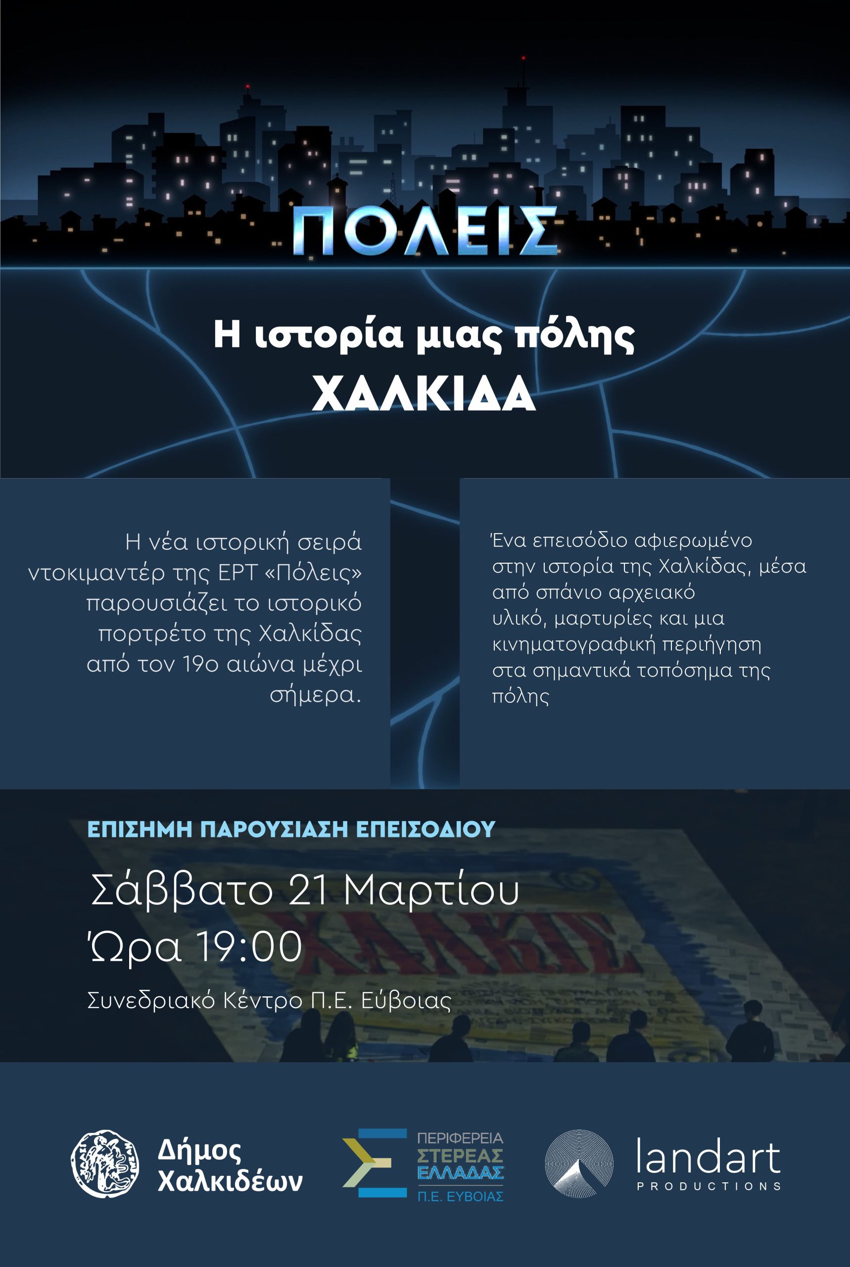 🖥️Ο Δήμος Χαλκιδέων, σε συνεργασία με την εταιρεία παραγωγής Landart και την Περιφέρεια Στερεάς Ελλάδας, θα πραγματοποιήσουν την επίσημη παρουσίαση του επεισοδίου στη Χαλκίδα, στο Συνεδριακό Κέντρο της Π.Ε. Εύβοιας, το Σάββατο 21 Μαρτίου 2026 και ώρα 19:00, σε μια ανοιχτή τελετή, παρουσία των συντελεστών, εκπροσώπων της δημόσιας τηλεόρασης και όλων, όσοι συνέβαλαν στην υλοποίηση της παραγωγής.