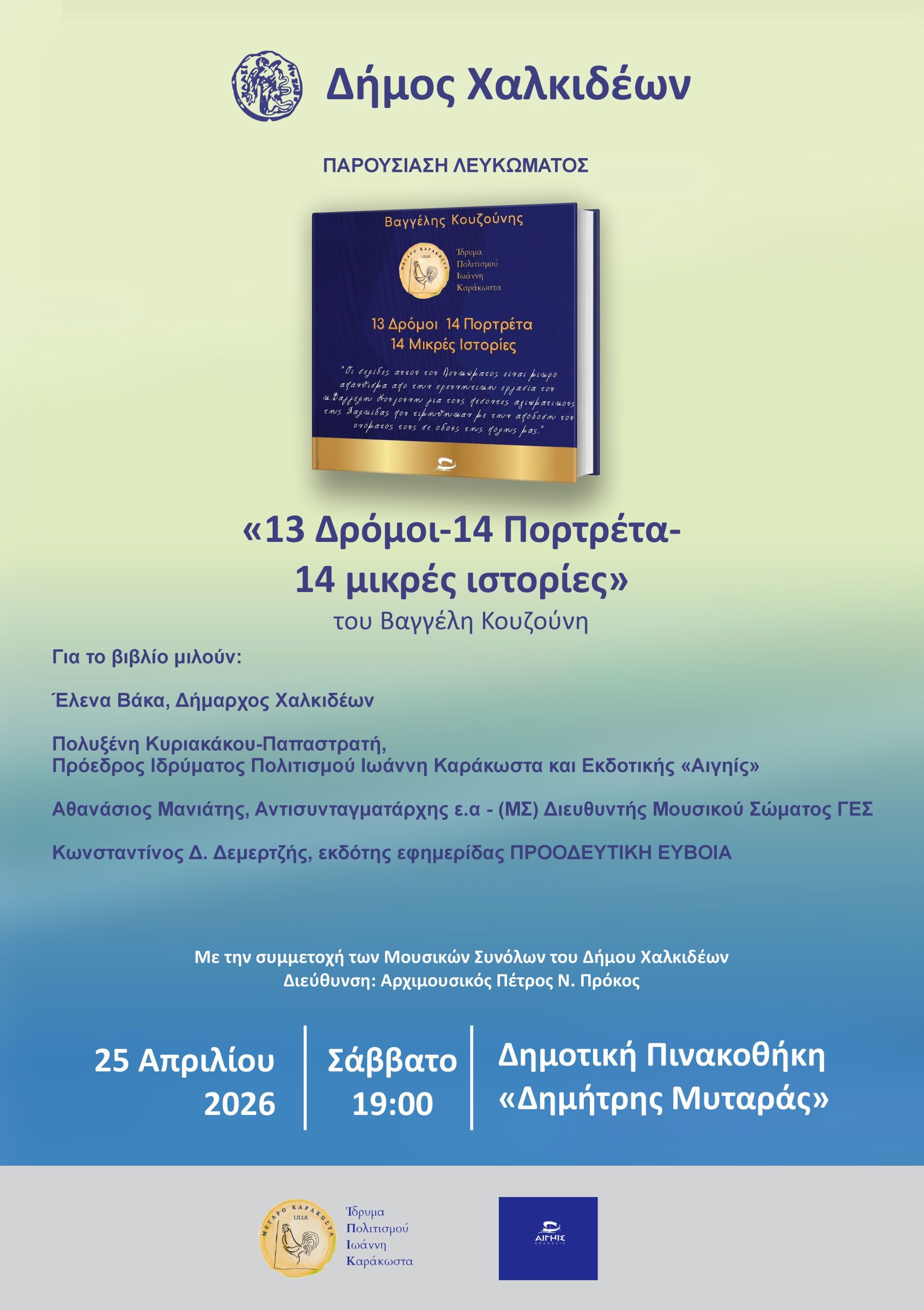 Ο Δήμος Χαλκιδέων σας προσκαλεί στην παρουσίαση του λευκώματος με τίτλο «13 Δρόμοι- 14 Πορτρέτα-14 μικρές ιστορίες» του συγγραφέα Βαγγέλη Κουζούνη, η οποία θα πραγματοποιηθεί το Σάββατο 25 Απριλίου 2026 και ώρα 19:00, στον χώρο της Δημοτικής Πινακοθήκης «Δημήτρης Μυταράς» (Λιάσκα 15).