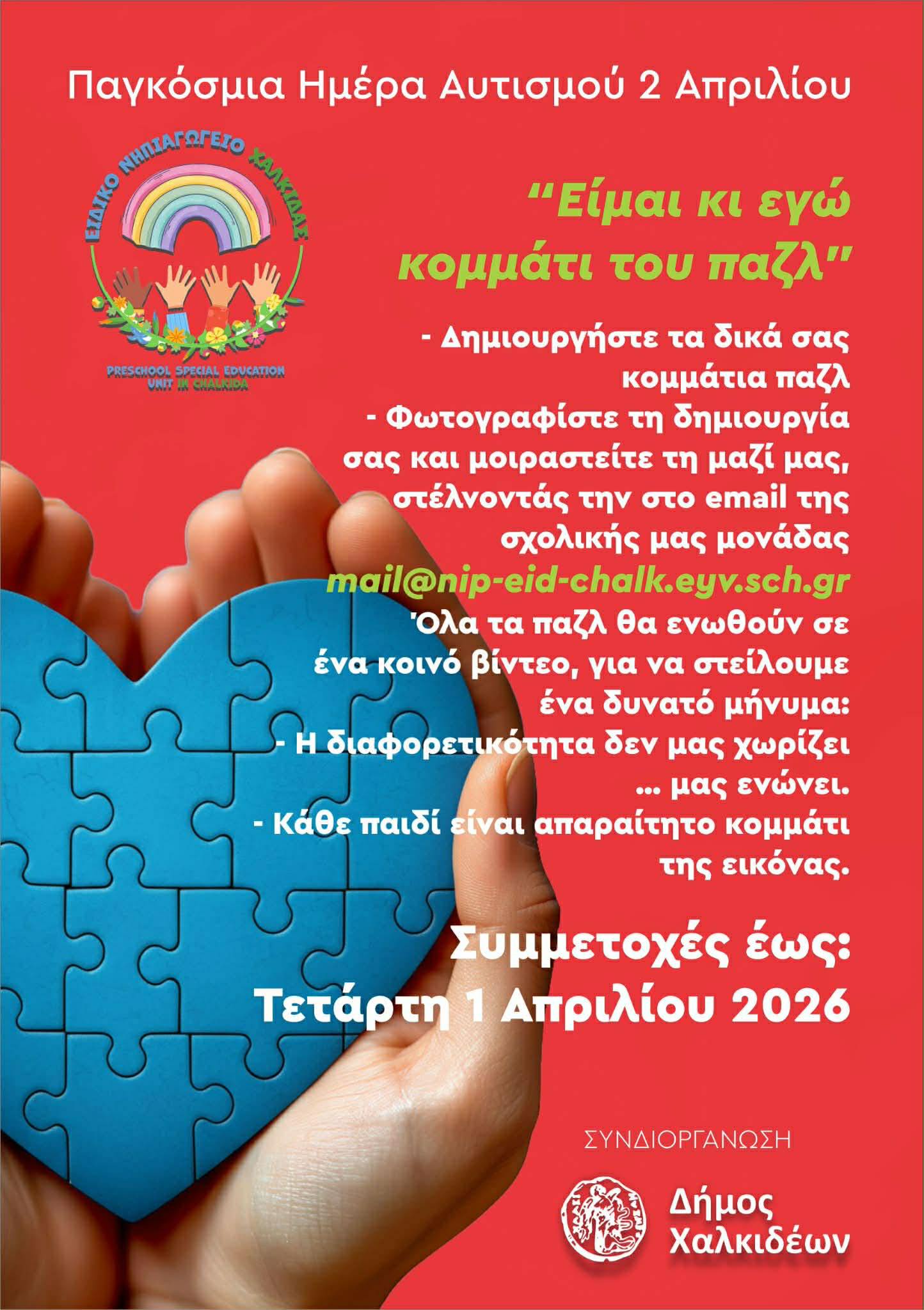 📣Μικροί και μεγάλοι δημιουργούν τα δικά τους κομμάτια παζλ, τα φωτογραφίζουν και τα στέλνουν στο email: mail@nip-eid-chalk.eyv.sch.gr, μέχρι και την Τετάρτη 1 Απριλίου 2026, ώστε να δημιουργηθεί ένα συλλογικό βίντεο με όλες τις δημιουργίες, που θα στέλνει ένα ηχηρό μήνυμα ενότητας και σεβασμού.